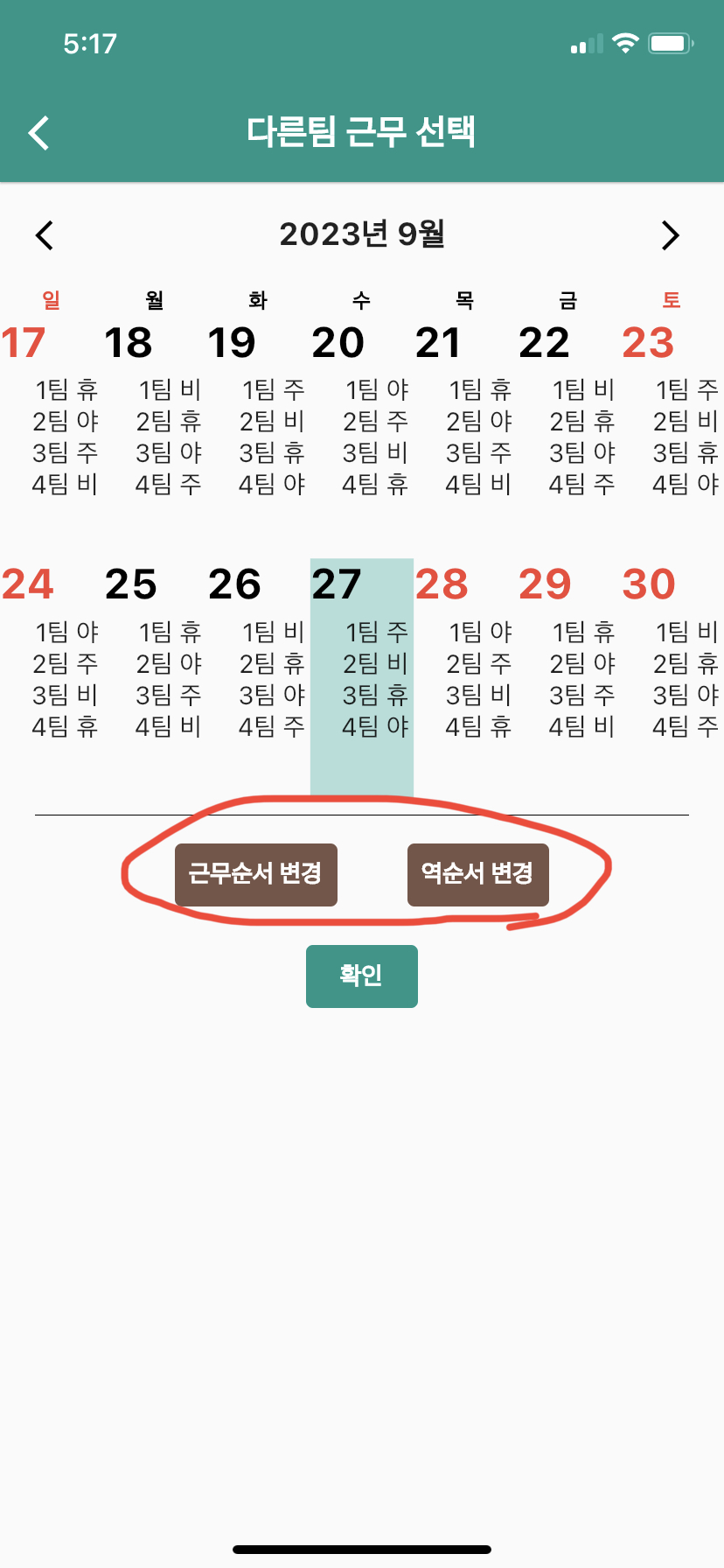 본인 근무뿐만 아니라 타 팀 근무까지 맞추어 설정하면 다른 팀 근무표까지 제대로 보실 수 있습니다.
