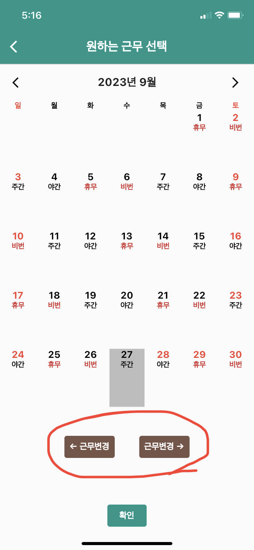 메인달력 좌측 상단 버튼을 눌러 '교대근무 선택'으로 들어갑니다.